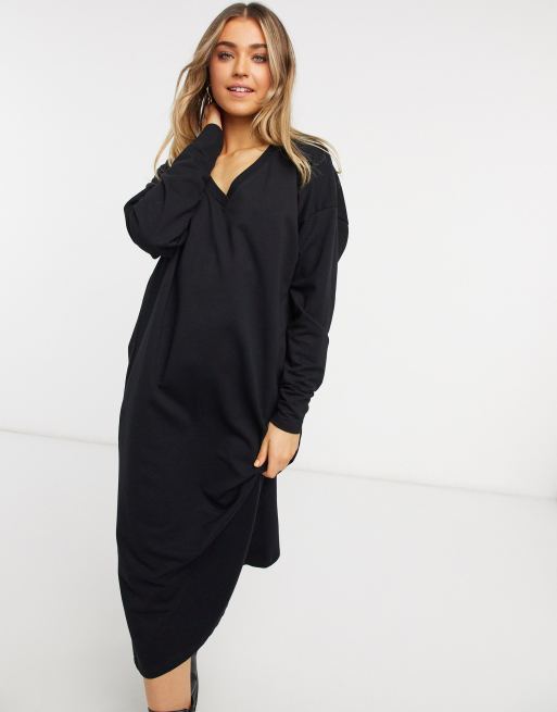ASOS DESIGN Midi jurk van sweatstof met V hals in zwart